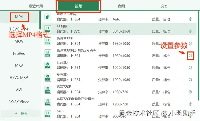 第三步: 点击界面上方的【视频】按钮,选择MP4格式,有需要的话还可以点击小齿轮图标设置比特率等参数。
