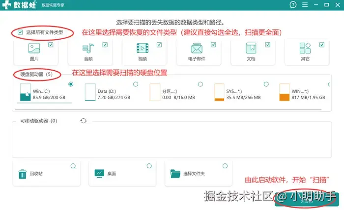 步骤1: 打开软件后选择需要恢复的数据类型和扫描位置,最后通过右下角按钮,启动软件开始扫描;