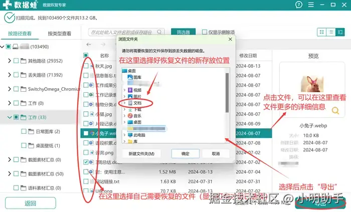 步骤2: 等待扫描文件全部显示出来后,在指定的位置选择自己需要恢复的文件,选定后点击“导出”;最后在弹窗里选择恢复文件的存放新位置(不能是原硬盘)。