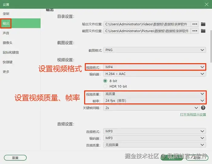 步骤3: 确定录制区域和音频来源,并根据需要设置视频格式(MP4、F4V、MOV)等等) 、质量(高质量、无损质量等)、帧数(10fps、20fps、24fps)等参数。设置好后点击 “REC” 按钮开始录制。
