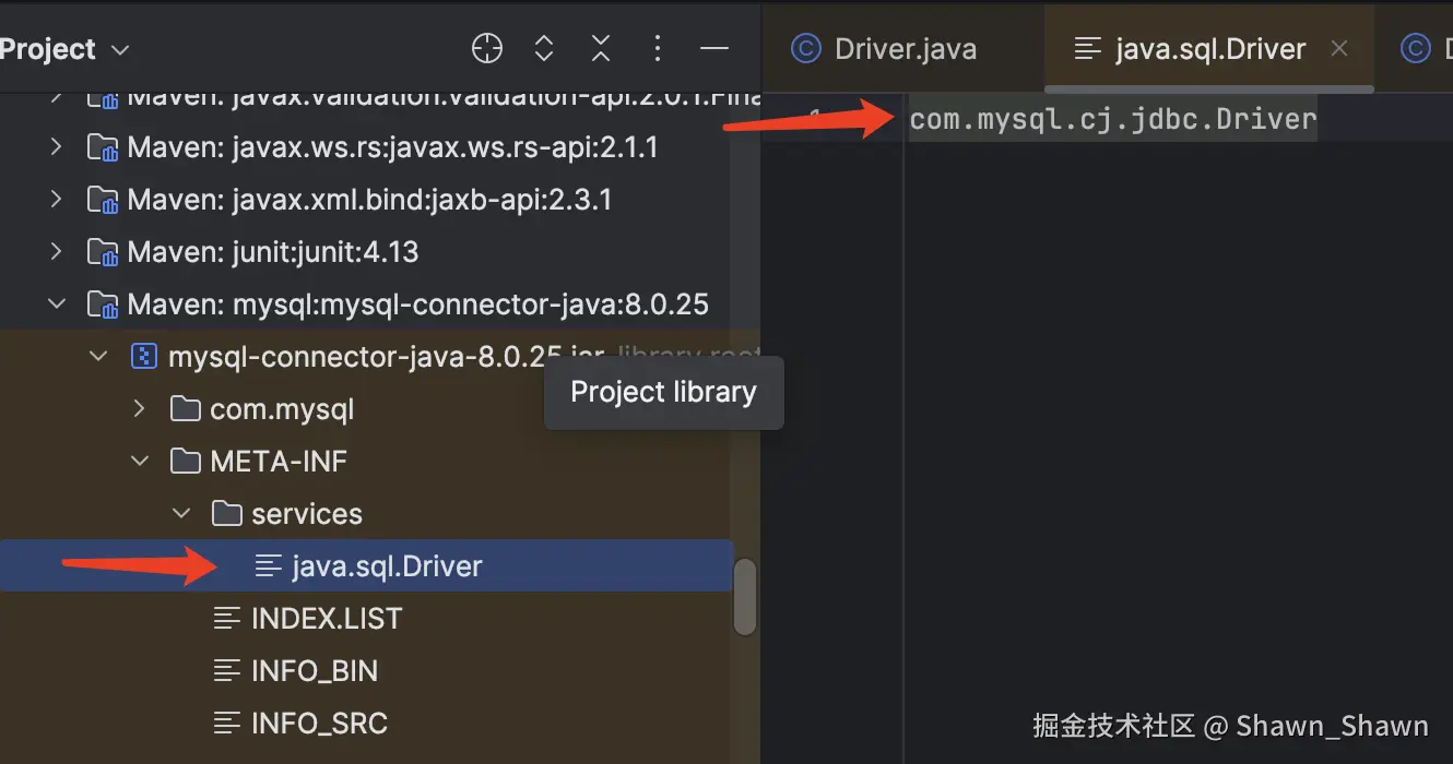 然后在该目录下,创建一个文件名为java.sql.Driver的文件,其文件名就是接口的全限定名,文件内容为com.mysql.cj.jdbc.Driver,为MySQL的驱动全限定名。