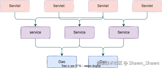 三层架构的主要目的是为了确保单一职责,视图层主要为了页面展示,服务层则为了处理复杂的业务逻辑,持久层则为了与数据库进行交互。层次越低复用程度越高,比如一个DAO对象往往会被多个 Service 对象使用,一个 Service 对象往往也会被多个Servlet对象使用: