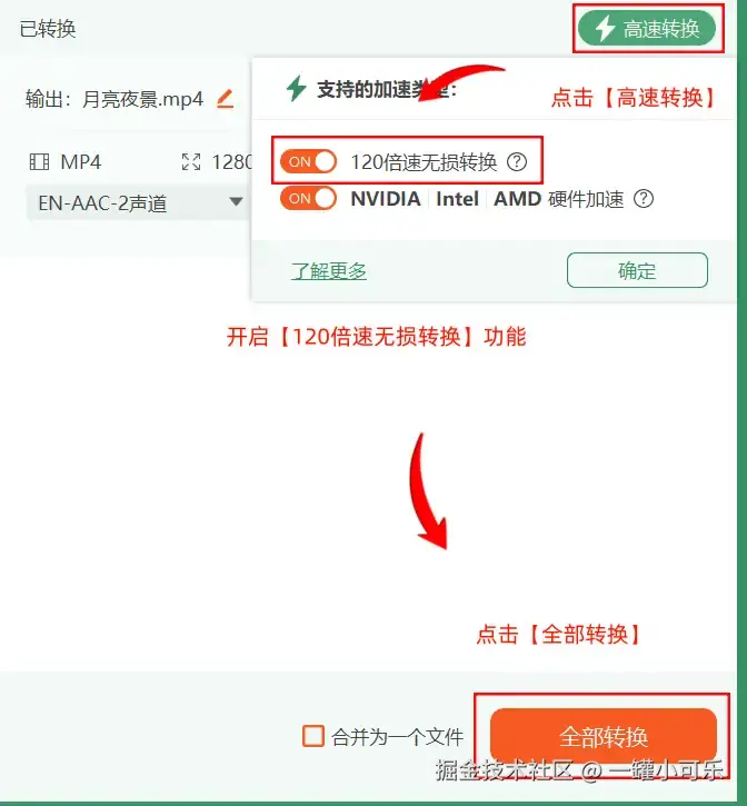 步骤3:选择好视频格式以后,点击【高速转换】开启【120倍速无损转换】功能,然后点击【全部转换】。
