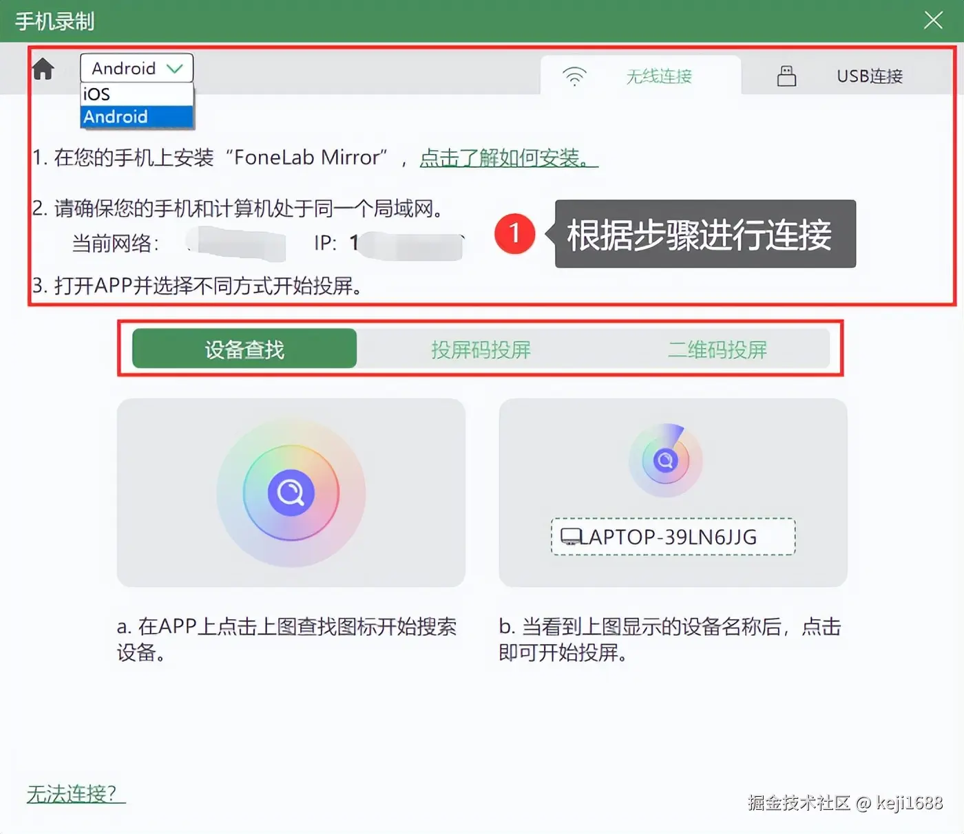 步骤1:将小米手机连接到电脑上,启动软件在录制模式中选择 【手机录制】 ,并按照软件提示进行连接和投屏。