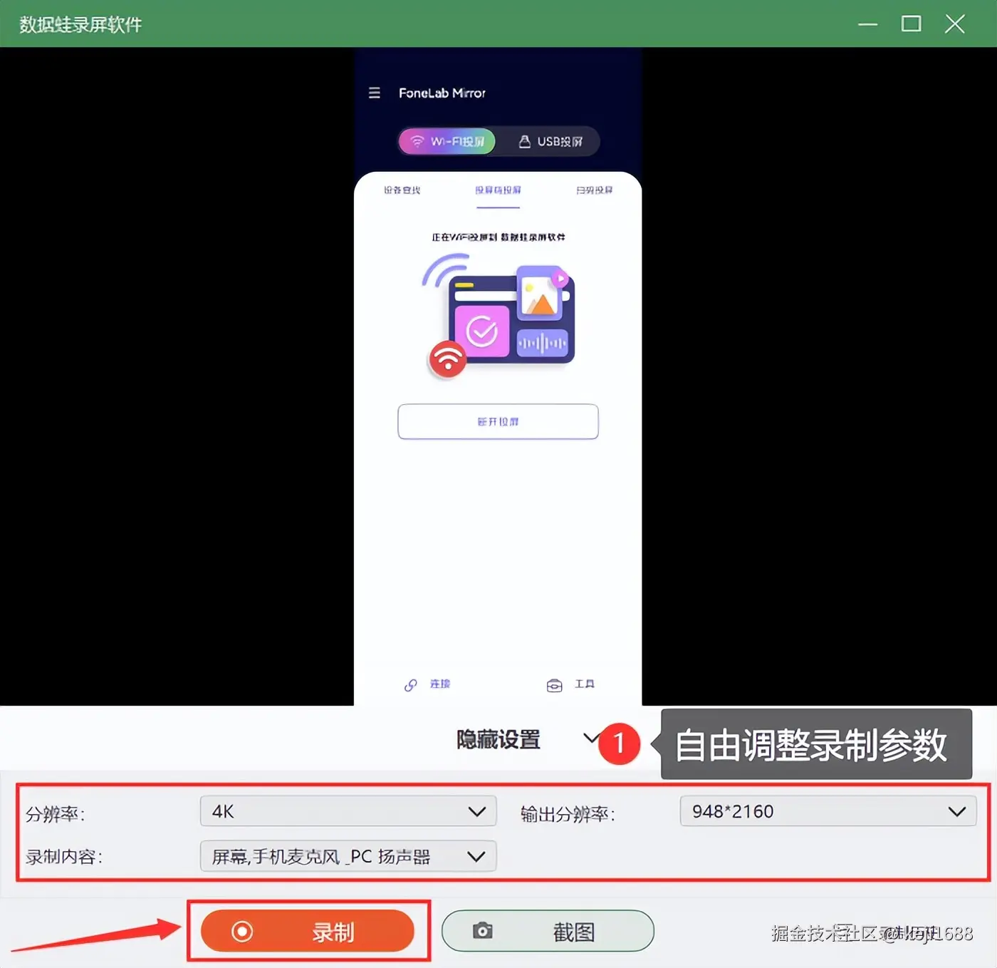 步骤2:将手机屏幕投屏到电脑上后,根据需求自由调整录制参数,如录制分辨率、录制内容等。设置完成后点击 【录制】 按钮进行录屏。