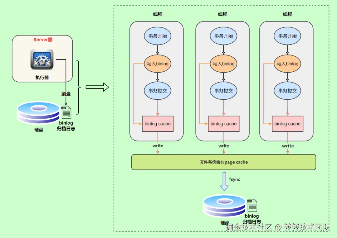 事务执行过程中,先把日志写到 Binlog Cache(Server 层的 Cache),事务提交的时候,再把 Binlog Cache 写到 Binlog 文件中。