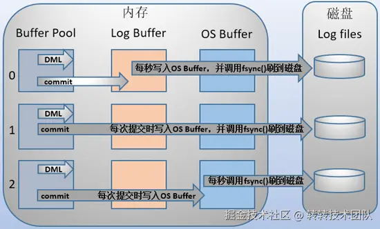 Redo Log Buffer刷盘策略主分为三种,由核心参数innodb_flush_log_at_trx_commit来控制。具体的流程如同下图:
