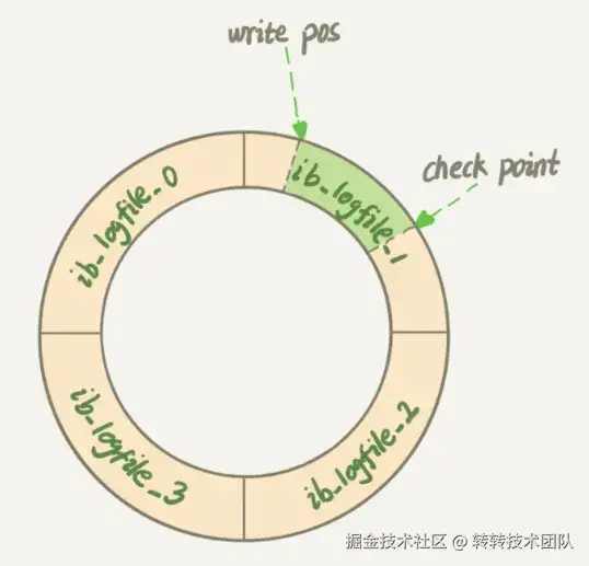 当进行数据页刷盘操作(checkpoint)时,checkpoint指针会顺时针移动,覆盖掉已写入的黄色区域,使其变为绿色。