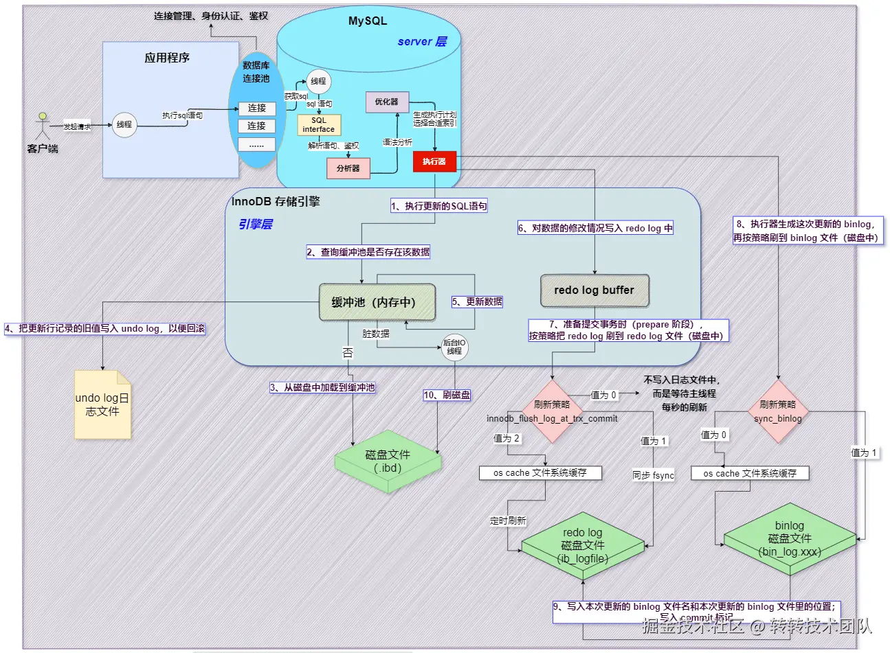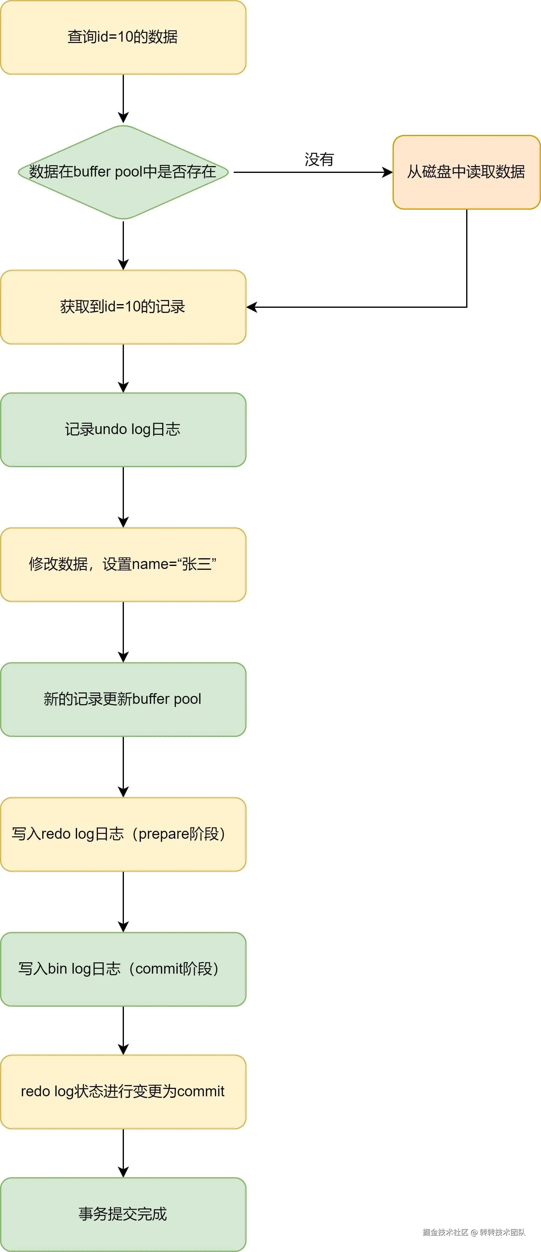 我们简单列举一条SQL为例 update table set name=“张三” where id = 10。具体的还行流程如下图:
