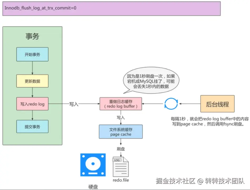 刷盘时机:在每次事务提交时,InnoDB会将日志缓冲区的内容写入操作系统的文件系统缓存(Page Cache),此时并不会执行fsync操作,日志的实际写入磁盘由操作系统决定。