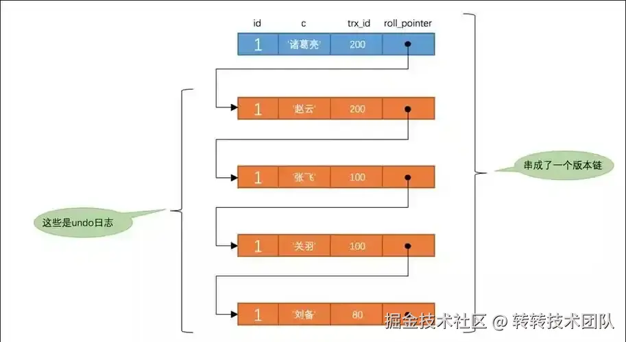 Undo Log 保存的是一个版本的链路,使用roll_pointer这个字段来连接的。多个事务的Undo Log 日志组成了一个版本链,如图: