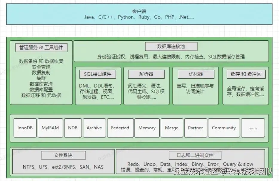 - 文件系统层:这一层主要包括日志文件、数据文件及与 MySQL 相关的其他程序。 在这四个层次中,服务层和存储引擎层构成了架构的核心。服务层负责处理 MySQL 的核心逻辑,而存储引擎层则直接负责数据的存取操作。