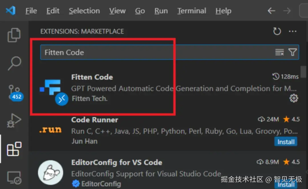 以 Visual Studio Code 为例,在扩展页面中搜索「Fitten Code」: