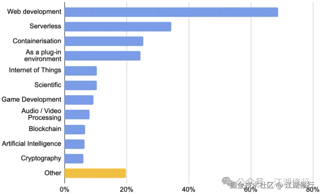 - WebAssembly最多的应用场景依然是在Web站点开发上,大约占65%。