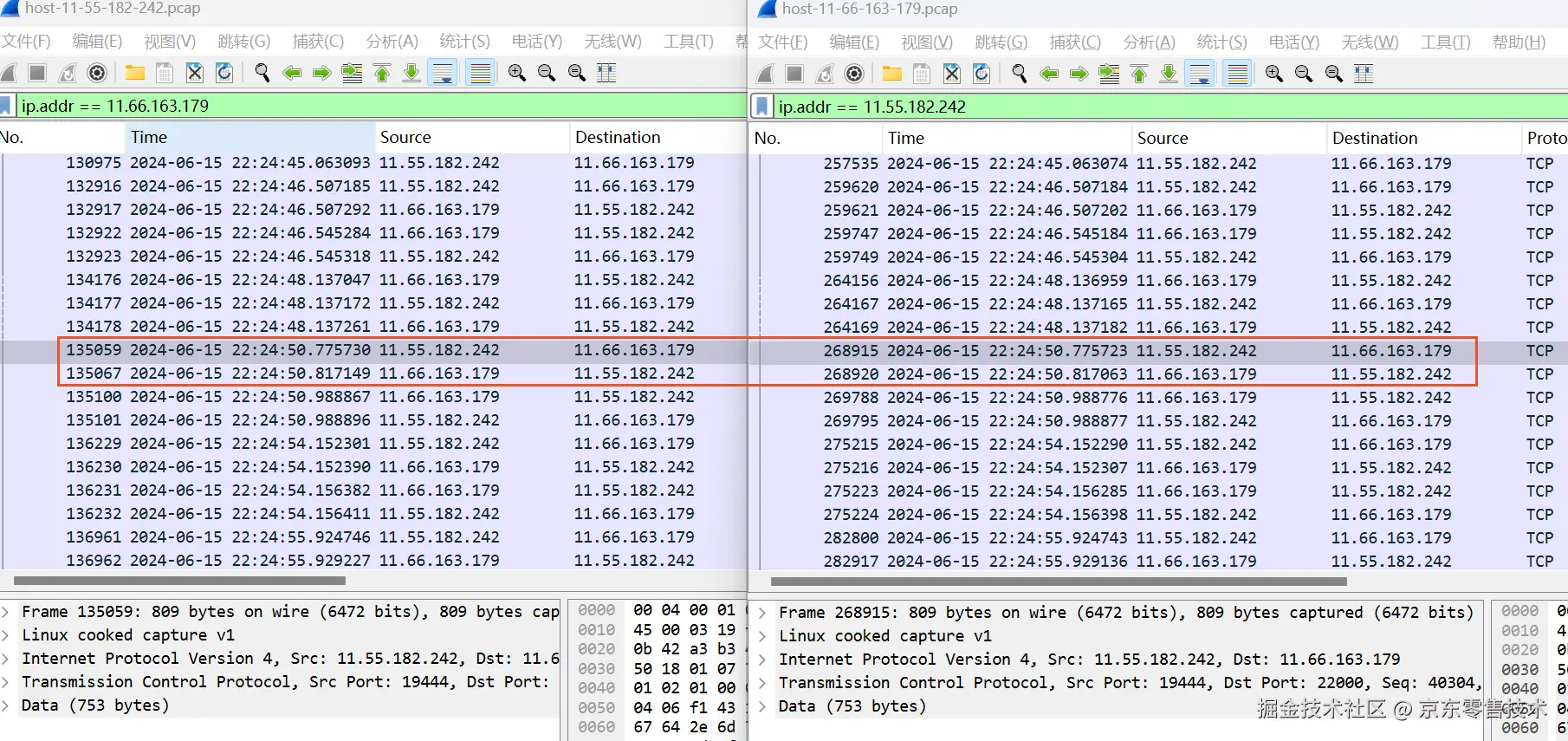 网络运维的同事帮忙对抓网络包,左边是调用方,右边是提供方,如下