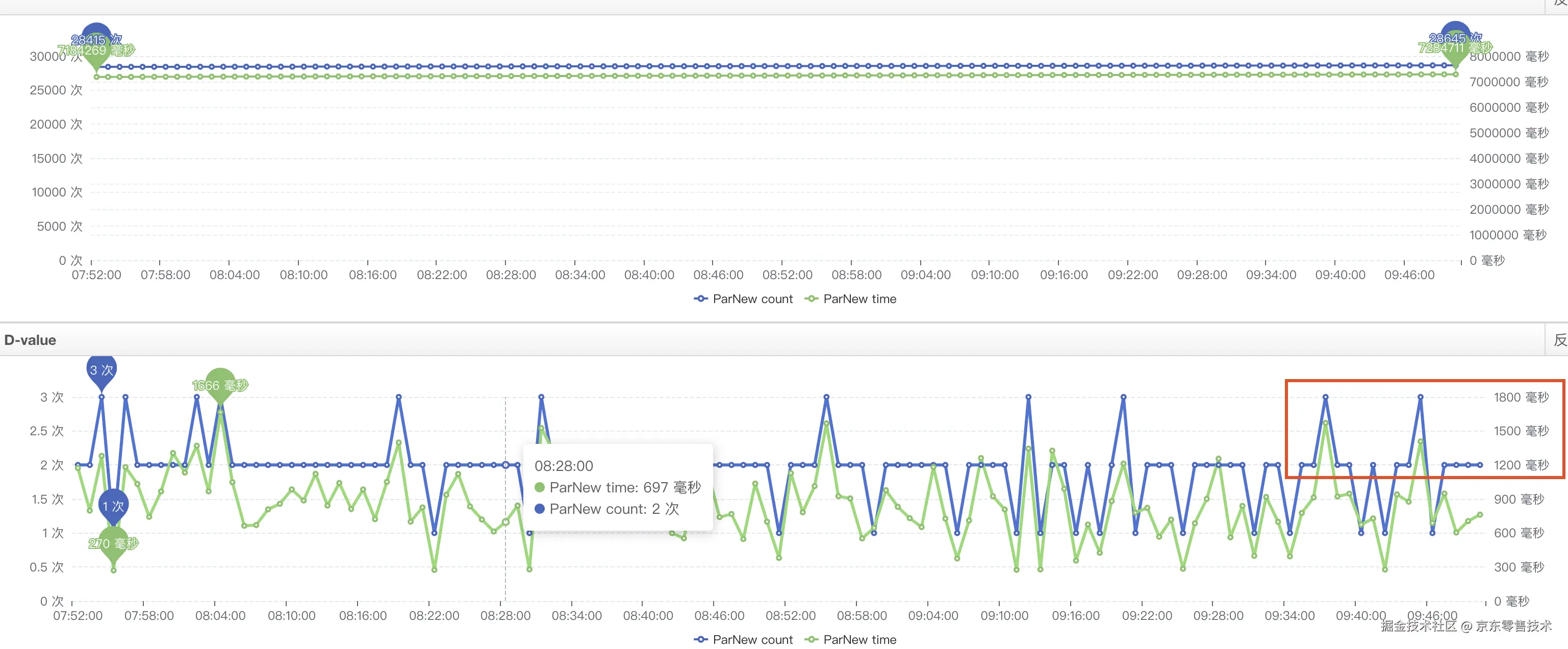 运维的同事帮忙分析了一波,给出年轻代GC耗时较高可能会影响耗时;如下