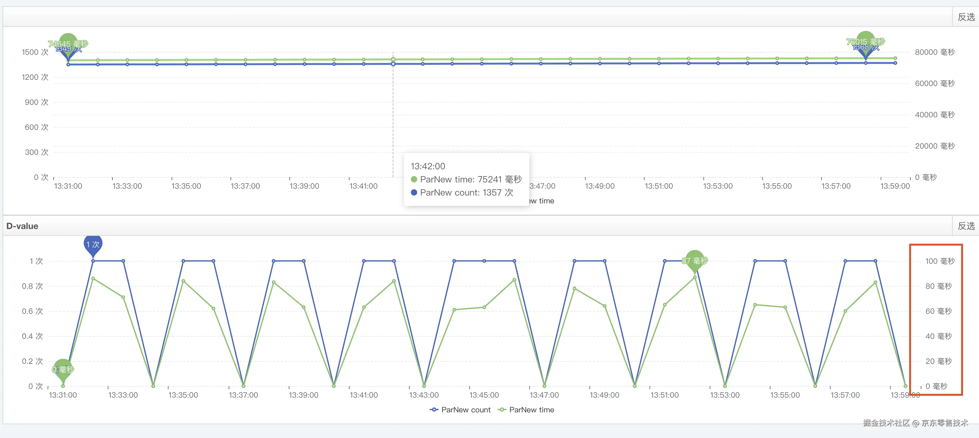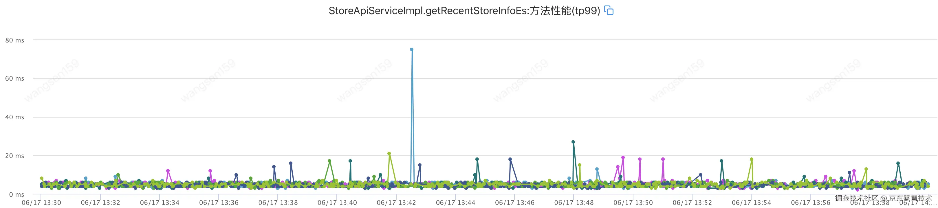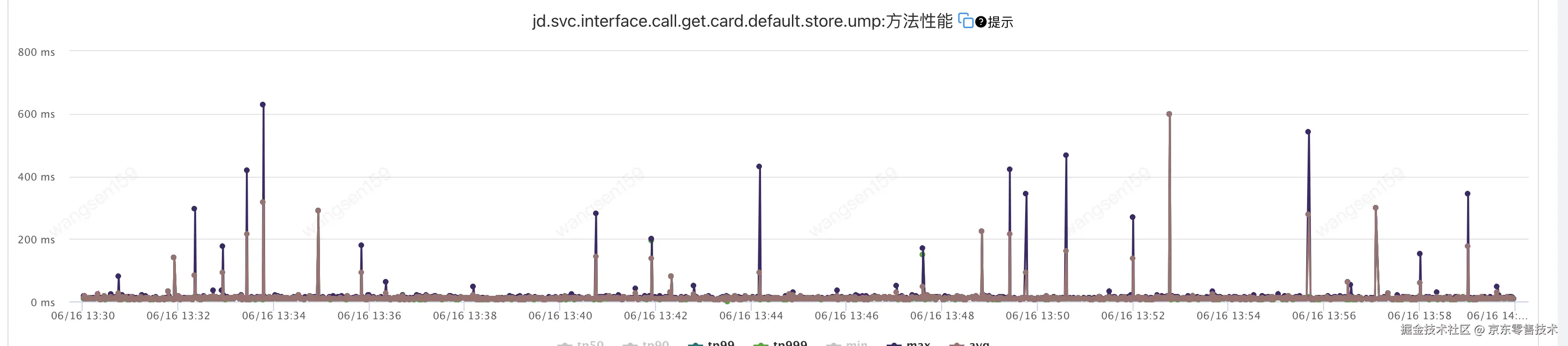 | 2024-06-15 13:30:00 至 2024-06-15 13:59:59 | 大部分是低于60ms 有突刺 | 大部分不超过20 | 580ms | 32ms | 24次 | 0 |