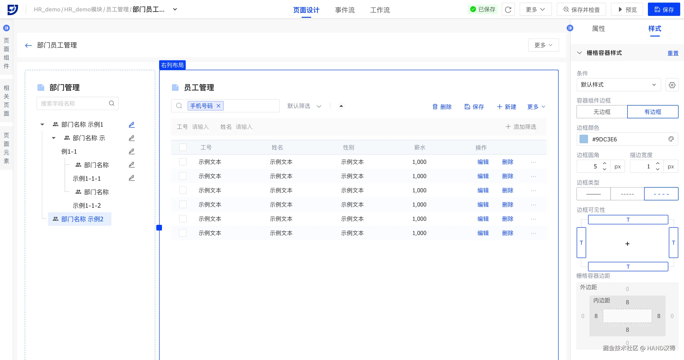 左树右表页面使用的布局容器组件也支持进行样式编辑,在当前场景中,为树组件与列表组件所在的布局容器配置<边框颜色>、<边框类型>等样式;