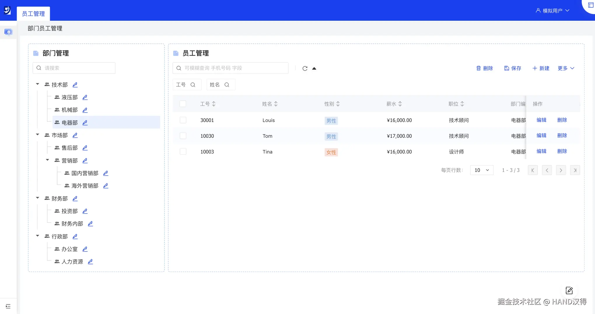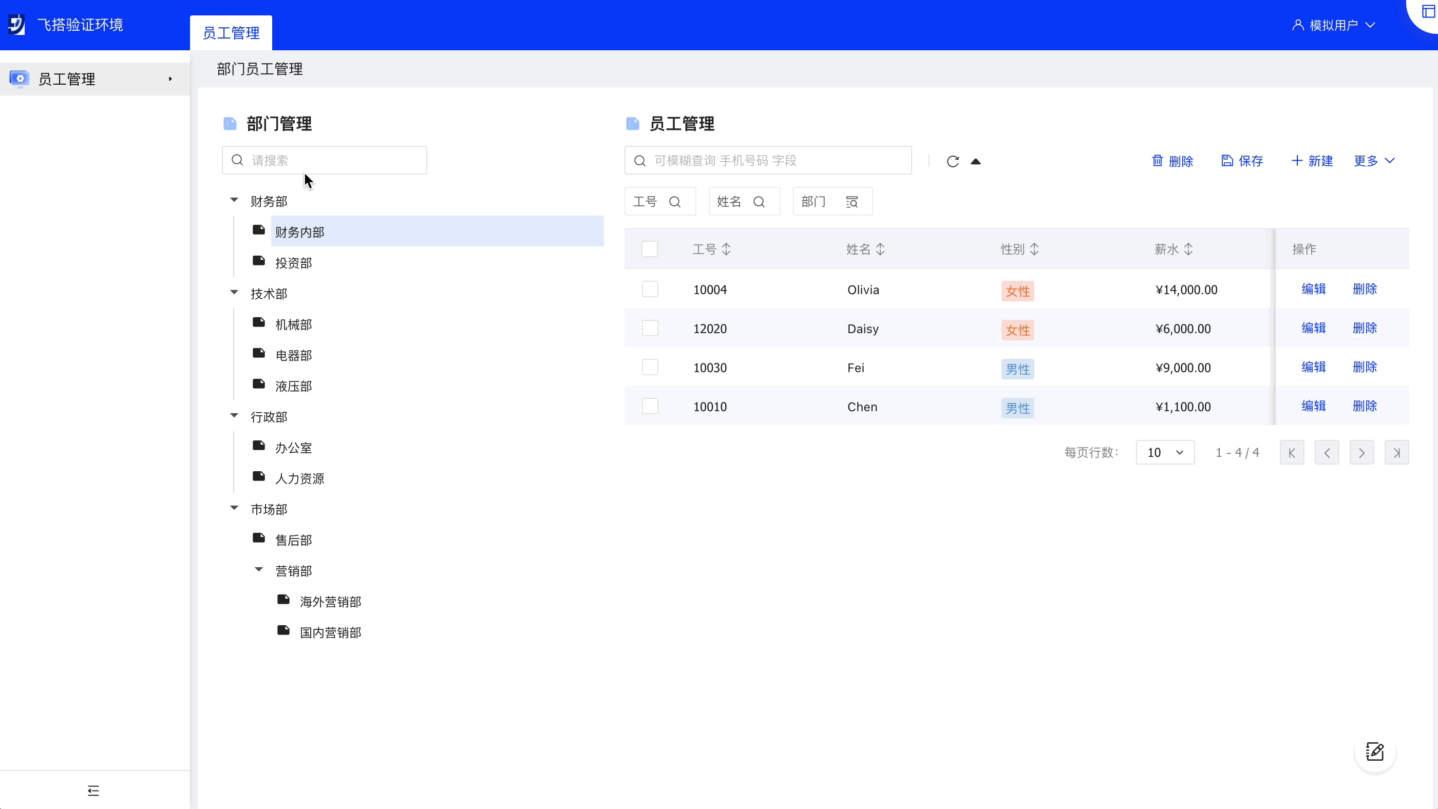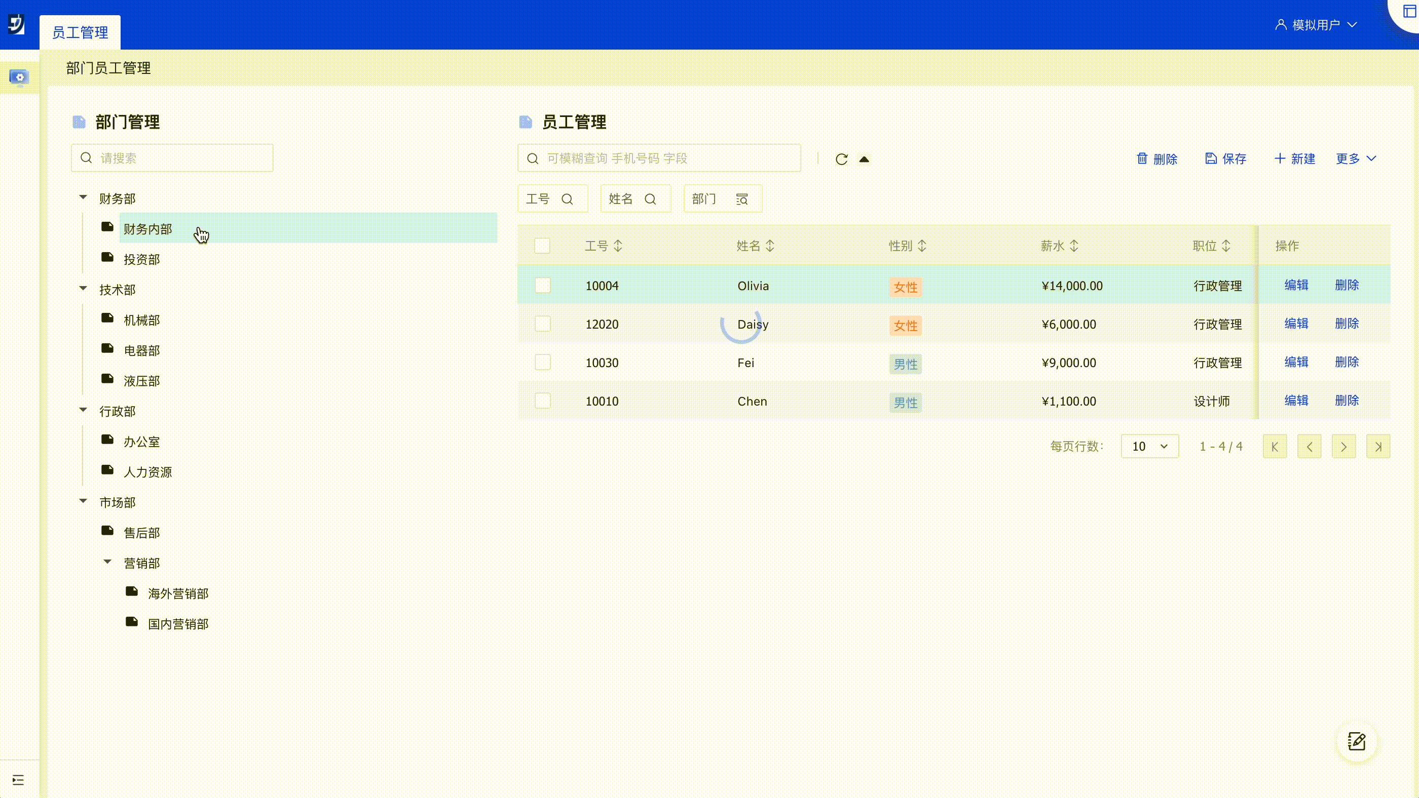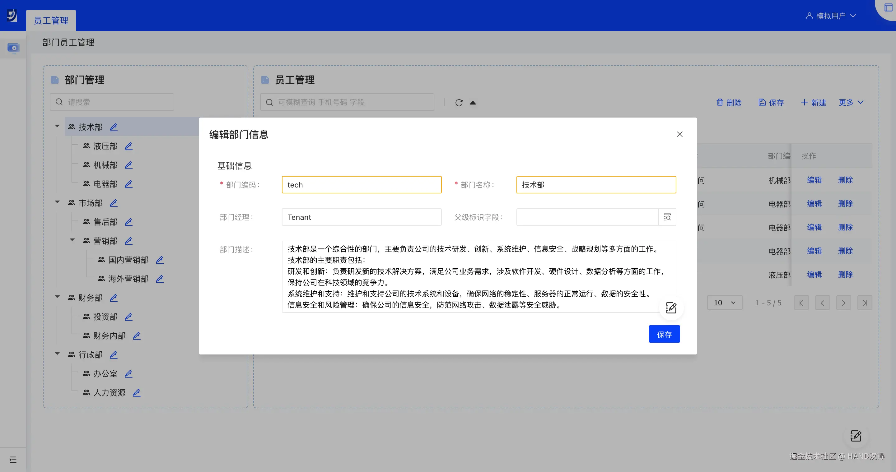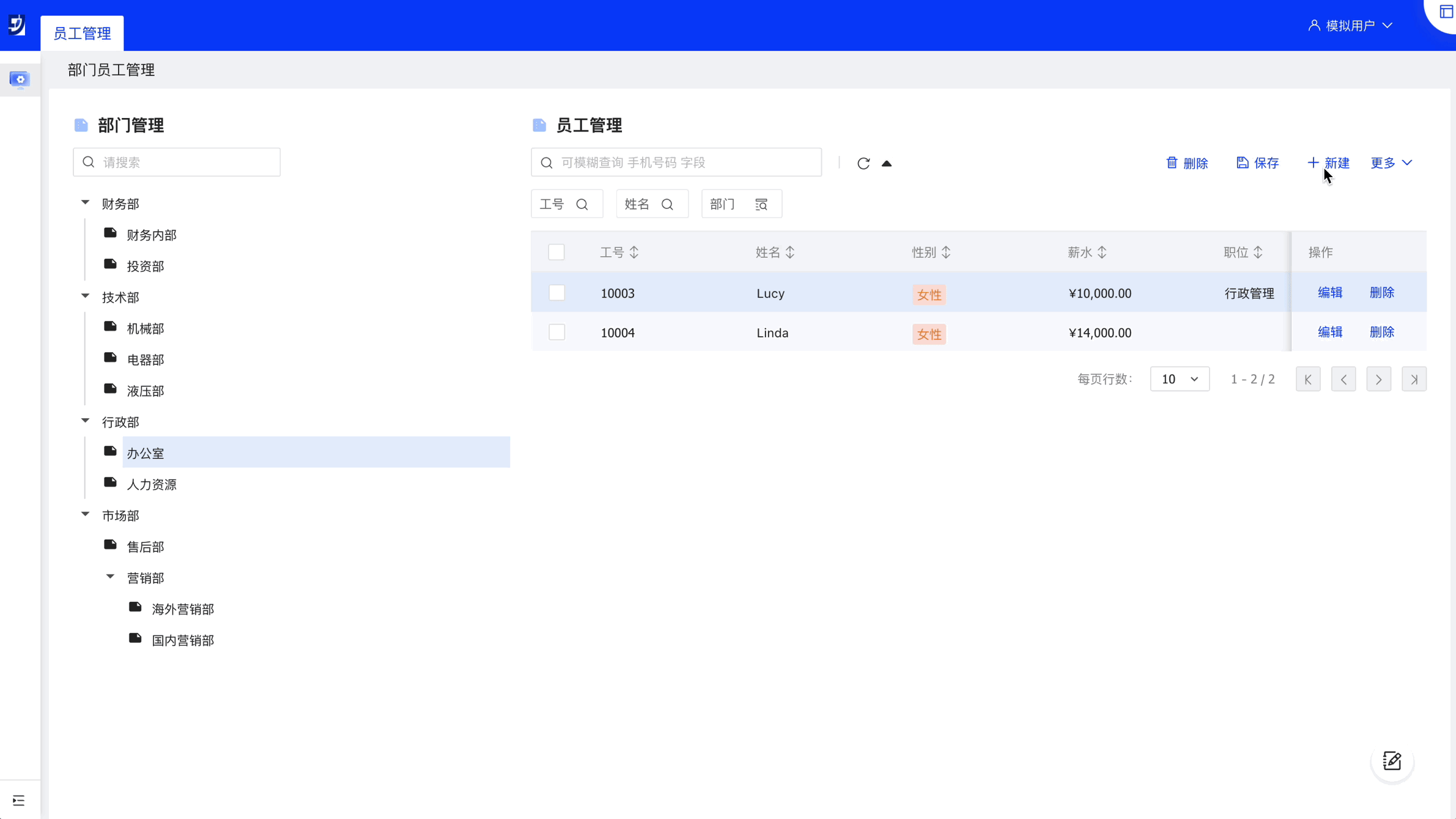 支持对该部门查询到的员工信息列表进行新建、删除、编辑、查询等操作,满足用户在不同场景下的数据处理需求;