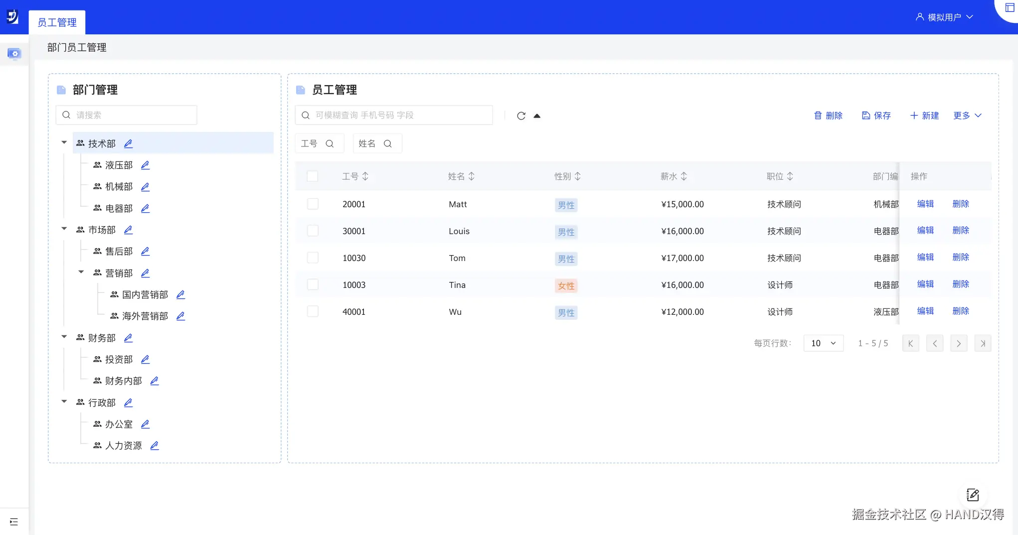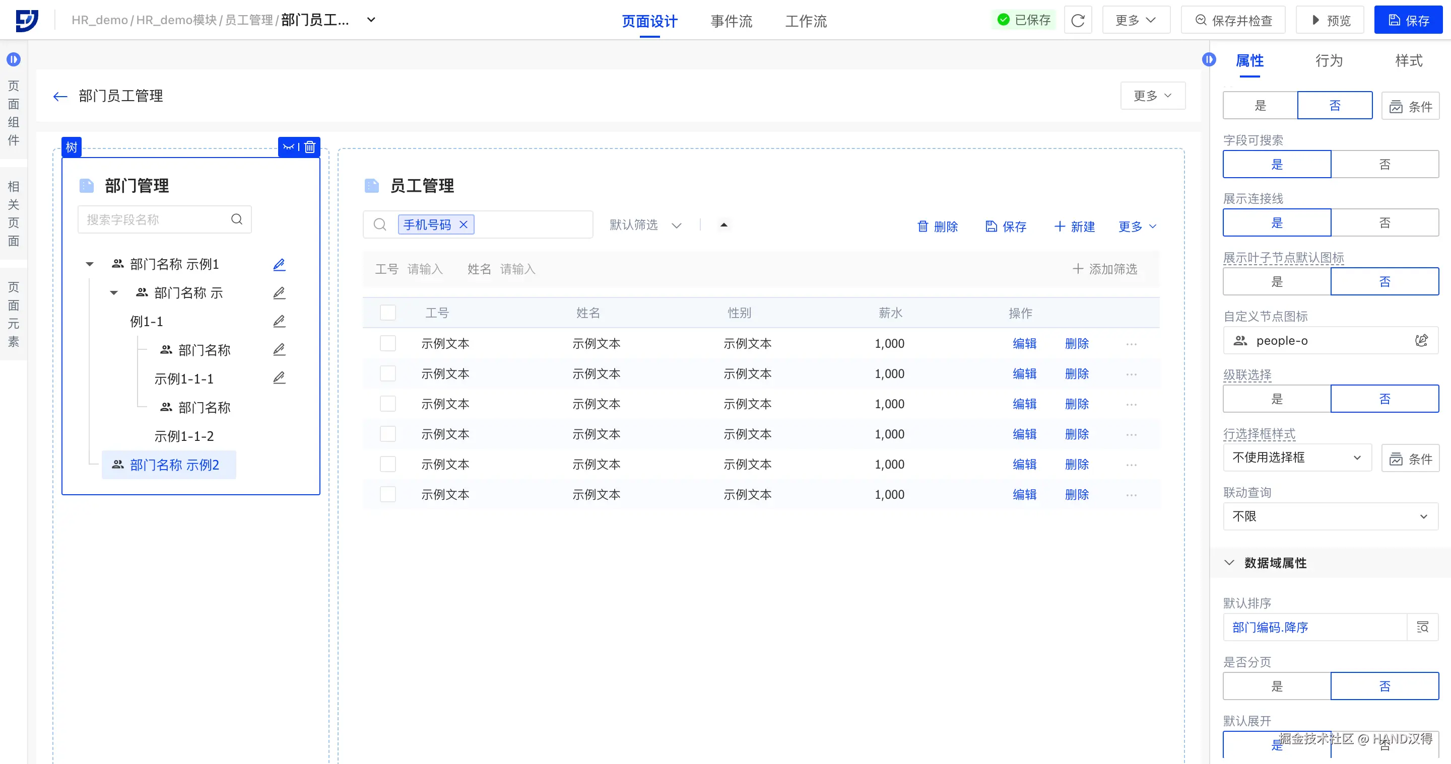 左树右表页面支持动态交互效果,如点击展开/折叠部门的节点。