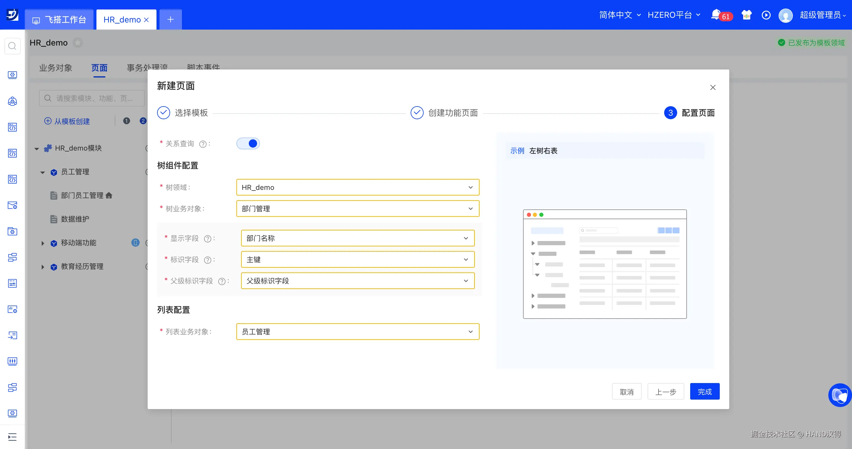 介绍在飞搭如何通过模板快速创建和配置生成左树右表页面;