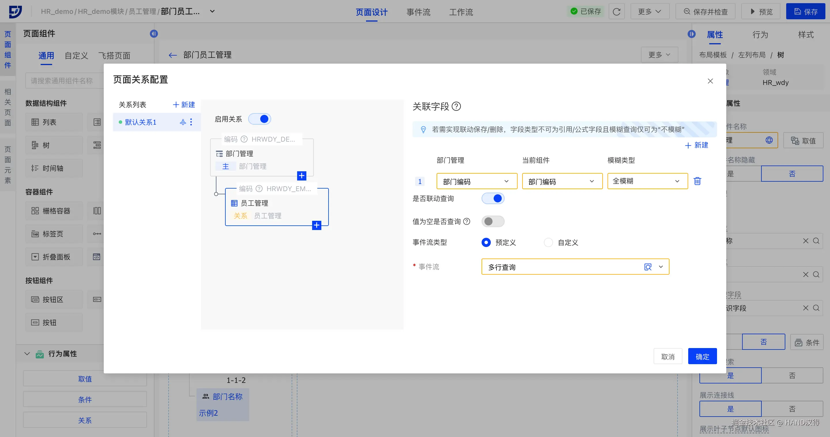 用户可修改树组件与列表组件默认生成的关系配置,当父级部门编码与子级部门编码支持模糊匹配时,可将组件<关联字段>的模糊类型修改为“全模糊”;