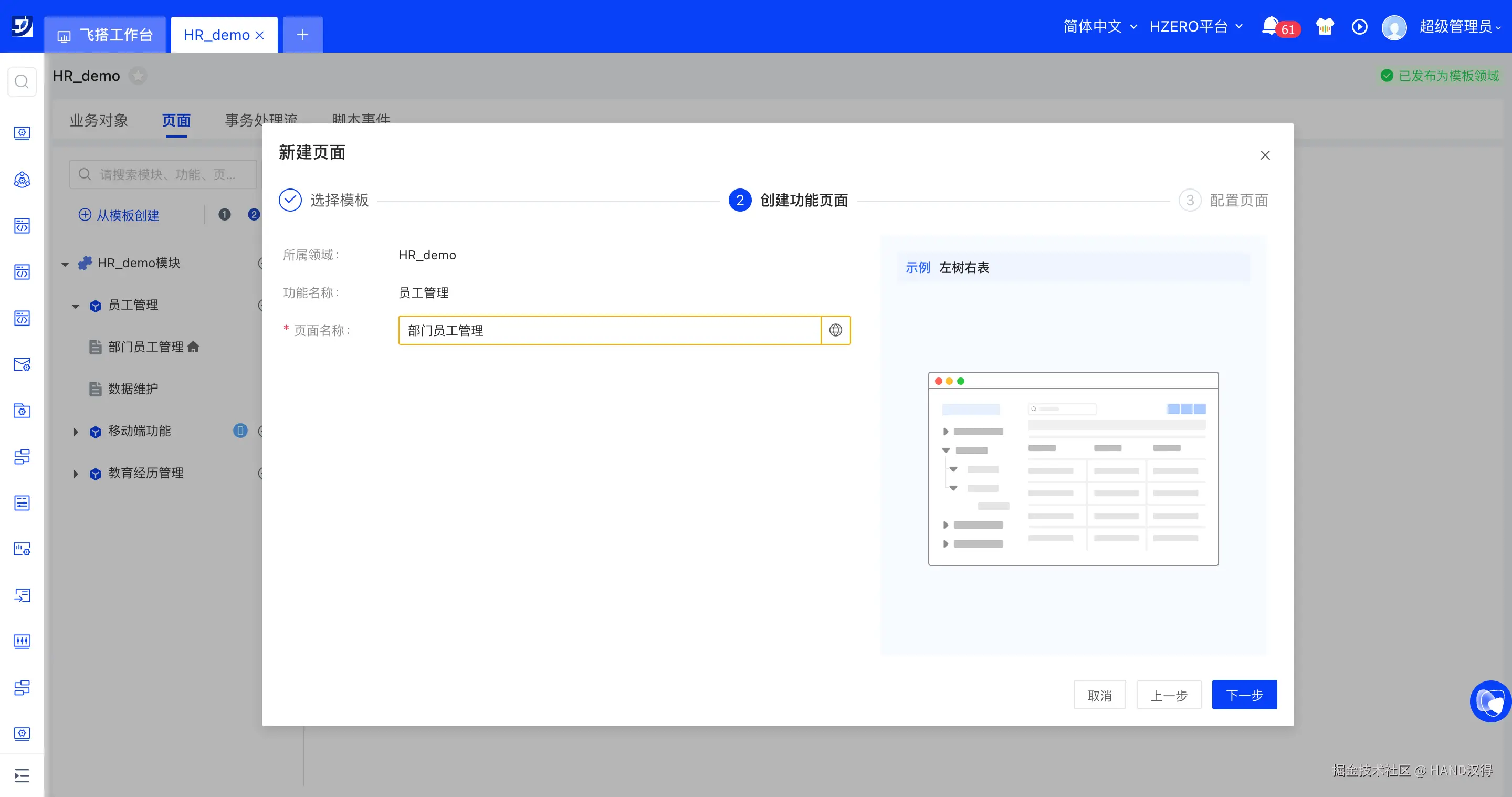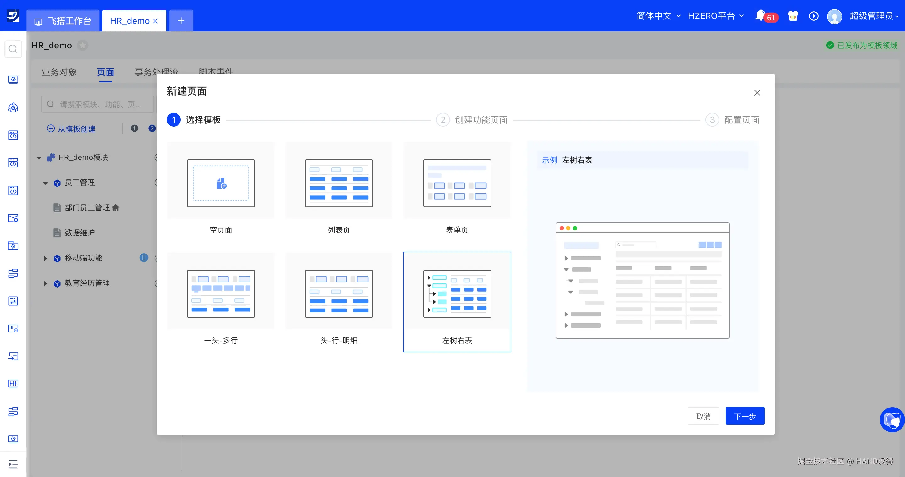 点击<从模板新建>按钮,点开新建页面弹窗,选择【左树右表】模板,点击下一步;
