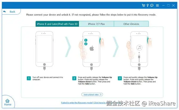 点击“开始”扫描您的 iPhone。它会在屏幕上显示您的 iDevice 信息。接下来,检查信息并按照提示将您的 iPhone 置于恢复模式或 DFU 模式。
