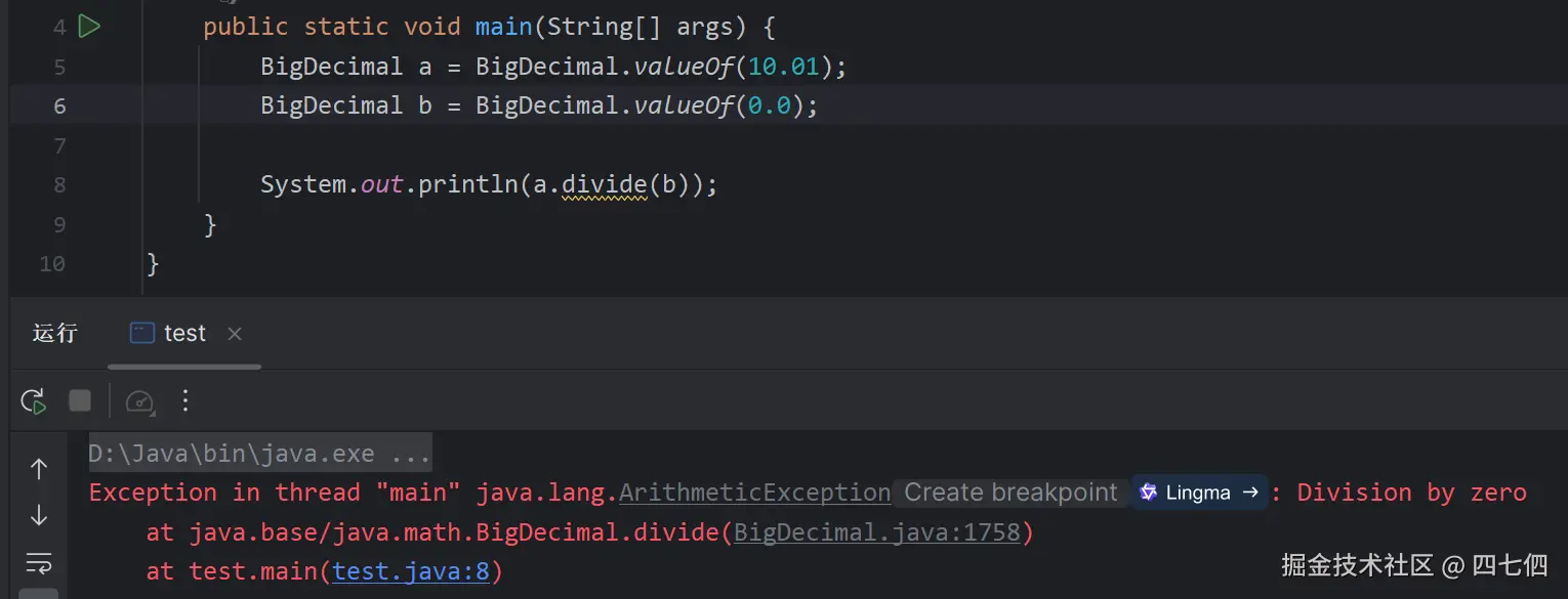 在涉及除法运算时,如果分母为 BigDecimal,要确保分母非零,否则会抛出 ArithmeticException。