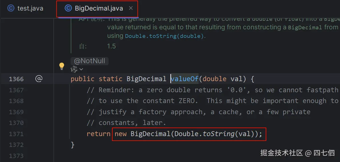 BigDecimal.valueOf(),等同于new BigDecimal(string),在BigDecimal源码中调用了new BigDecimal()方法,不需要手动创建对象,也能规避小数值时的精度损失。