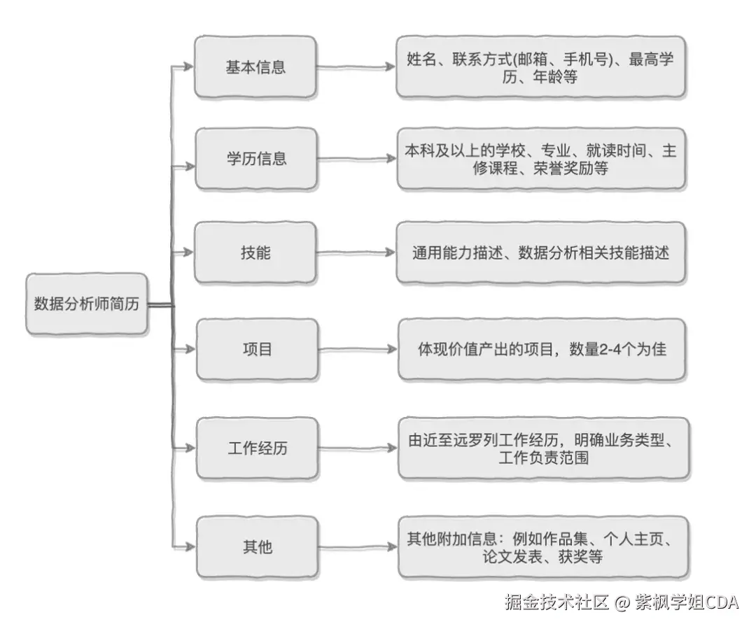 简历对于求职来说是最重要的敲门砖。一般来说,简历内容结构主要由6个方面构成:基本信息、学历信息、技能、项目、工作经历和其他附加信息等;
