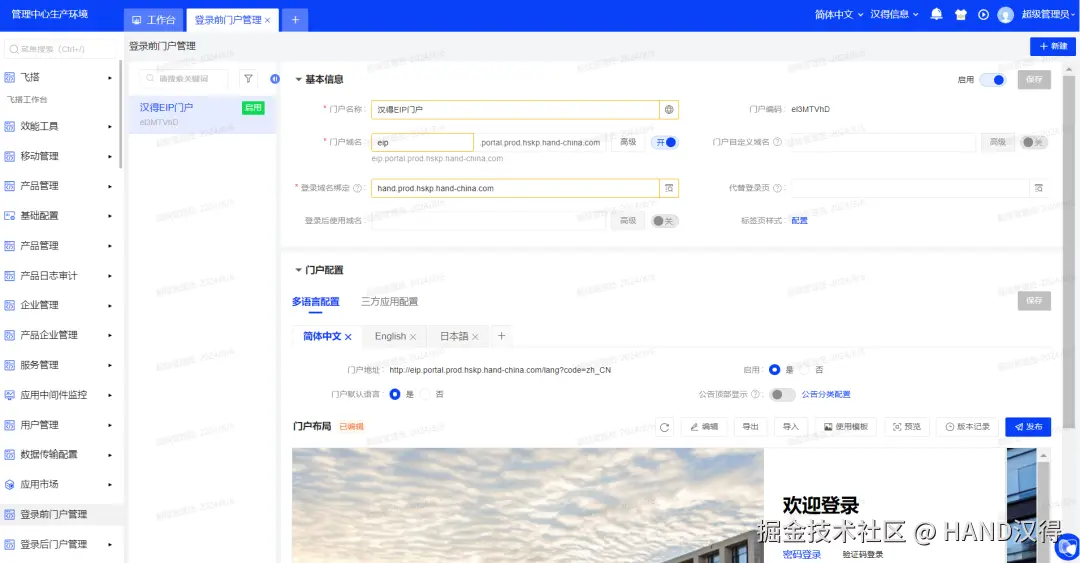 进入门户看板配置页面,右上角展示当前多语言布局,管理员可以按照需求配置不同多语言下的门户展示效果。