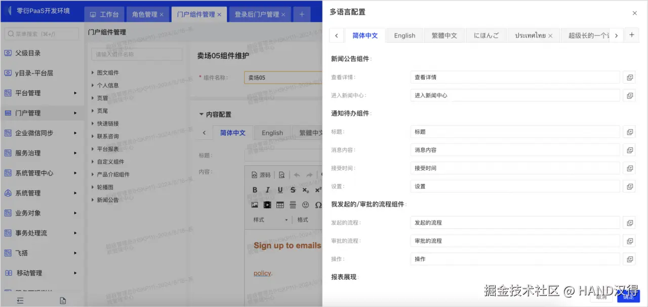 登录后门户页面上会展示提示性字段,而不是某个组件上的数据,所以这部分通用字段,可以统一在门户管理-门户数据管理-门户组件管理-多语言配置功能下维护。系统已经预置了四种通用的多语言及字段翻译,可供随时调整。