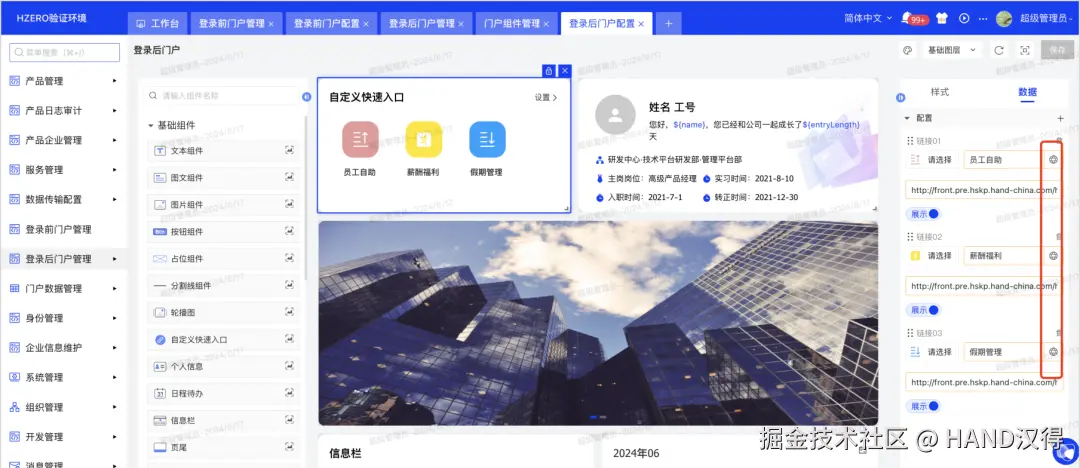 零衍系统管理平台统一门户管理,支持门户看板灵活配置,同时提供场景化的门户模板,丰富的门户组件,可协助用户快速搭建企业专属门户。
