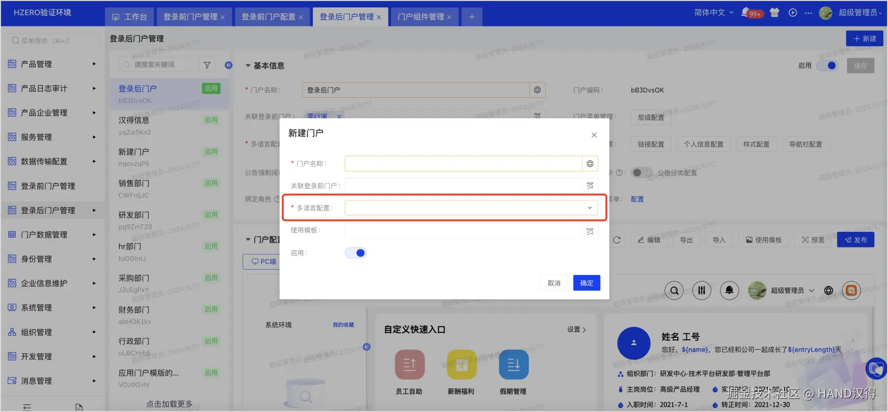新建登录后门户时,需要选择“多语言配置”信息,即可创建对应多语言布局下的门户。可选择的多语言数据来源于系统语言设置。
