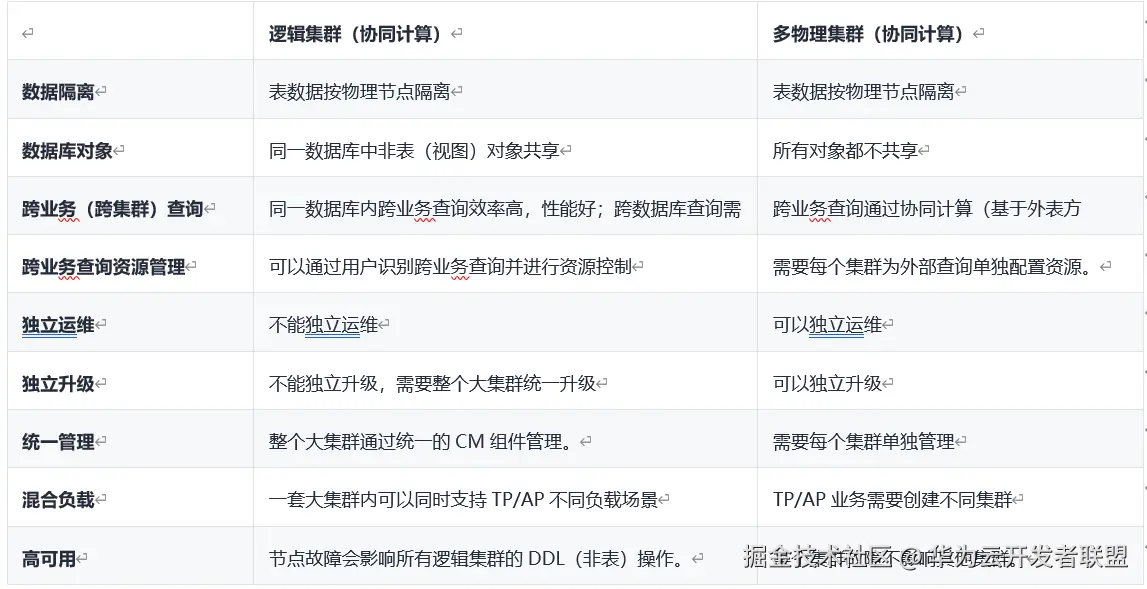 以当前较为常见的使用多套集群做隔离来对比逻辑集群的特点, 如下所示: