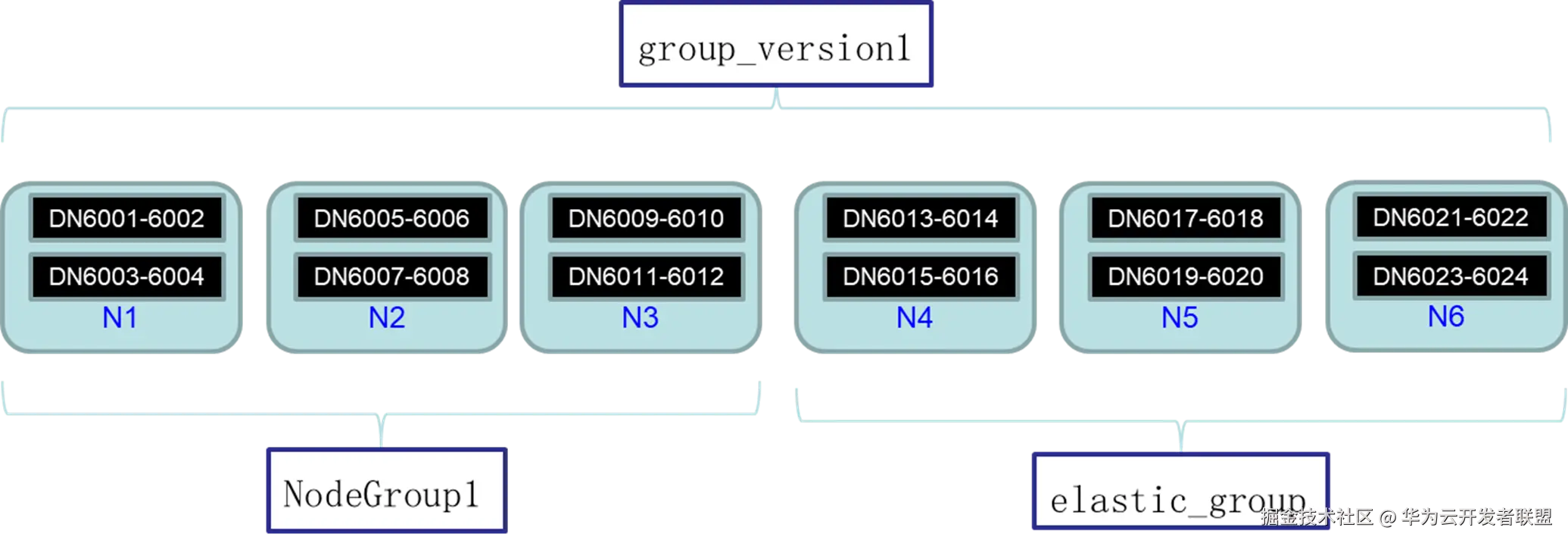 例如下图中, 全新的集群包含DN1DN6 6个节点, 我们将DN1DN3用来创建逻辑集群NodeGroup1, 剩下未使用的DN4~DN6暂时将放入弹性池中, 后续可以用来创建新的逻辑集群.