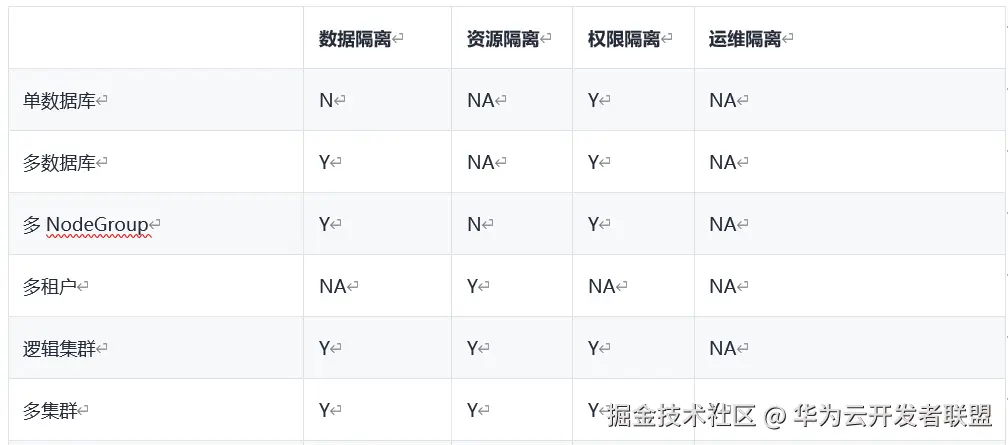 逻辑集群实现了一个大集群按节点拆分为不同的节点组(NodeGroup), 最主要的就是增加了隔离性, 隔离包括数据隔离,资源隔离,权限隔离,运维隔离. 逻辑集群支持数据隔离,资源隔离,权限隔离,不支持运维隔离. 下图对了当前主要的部署场景的隔离性: