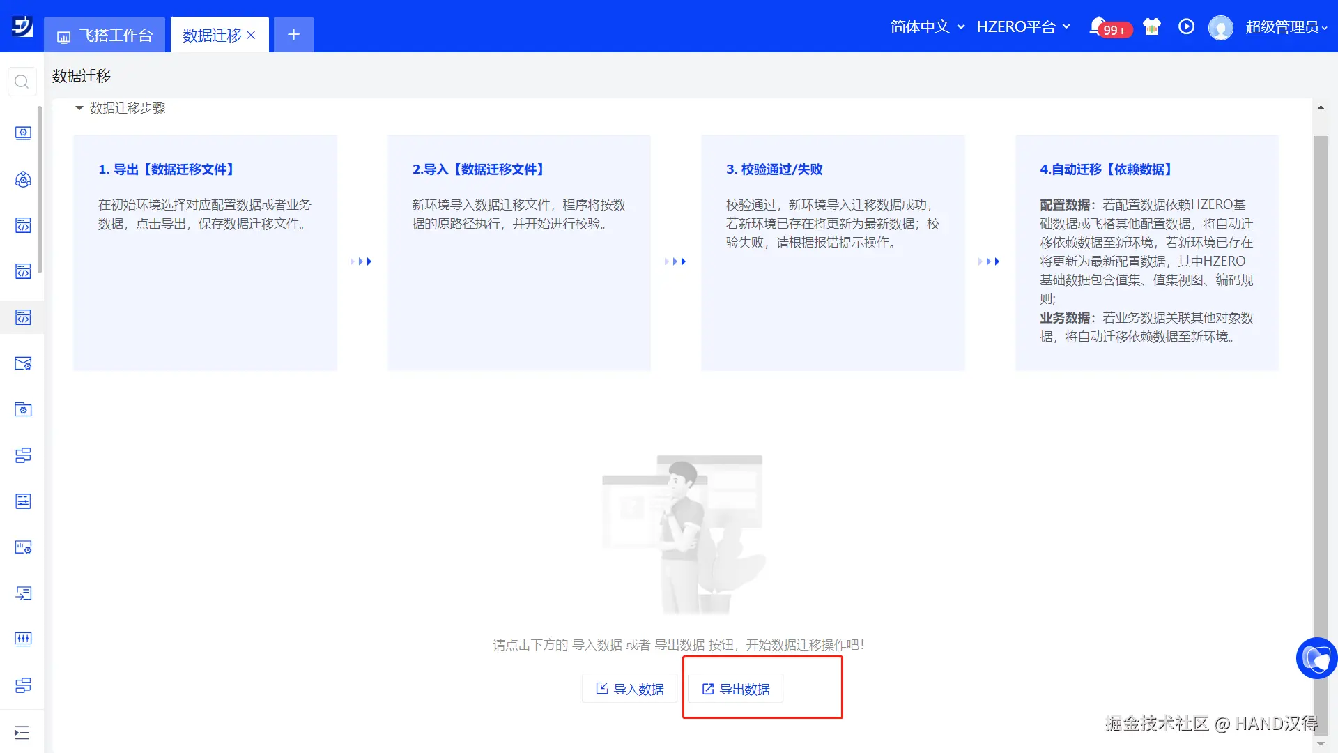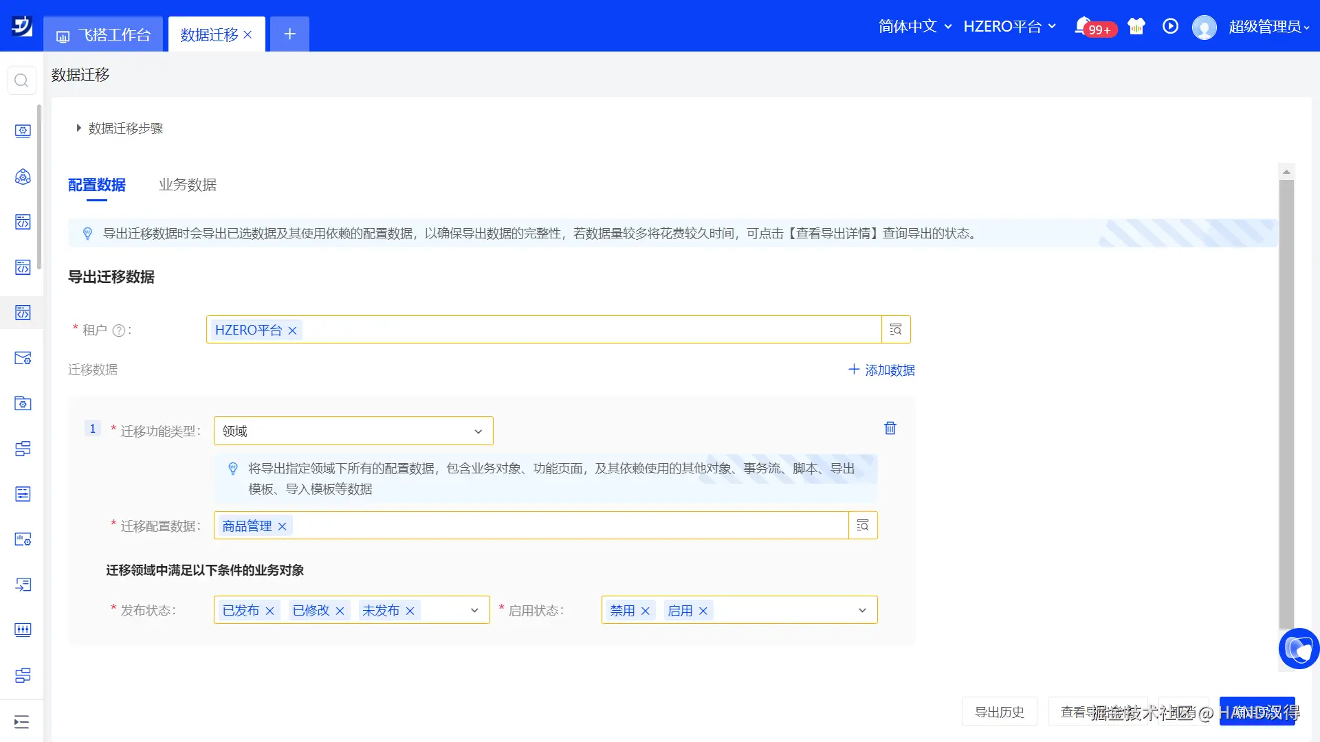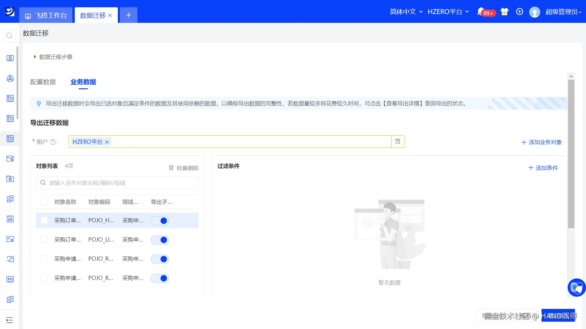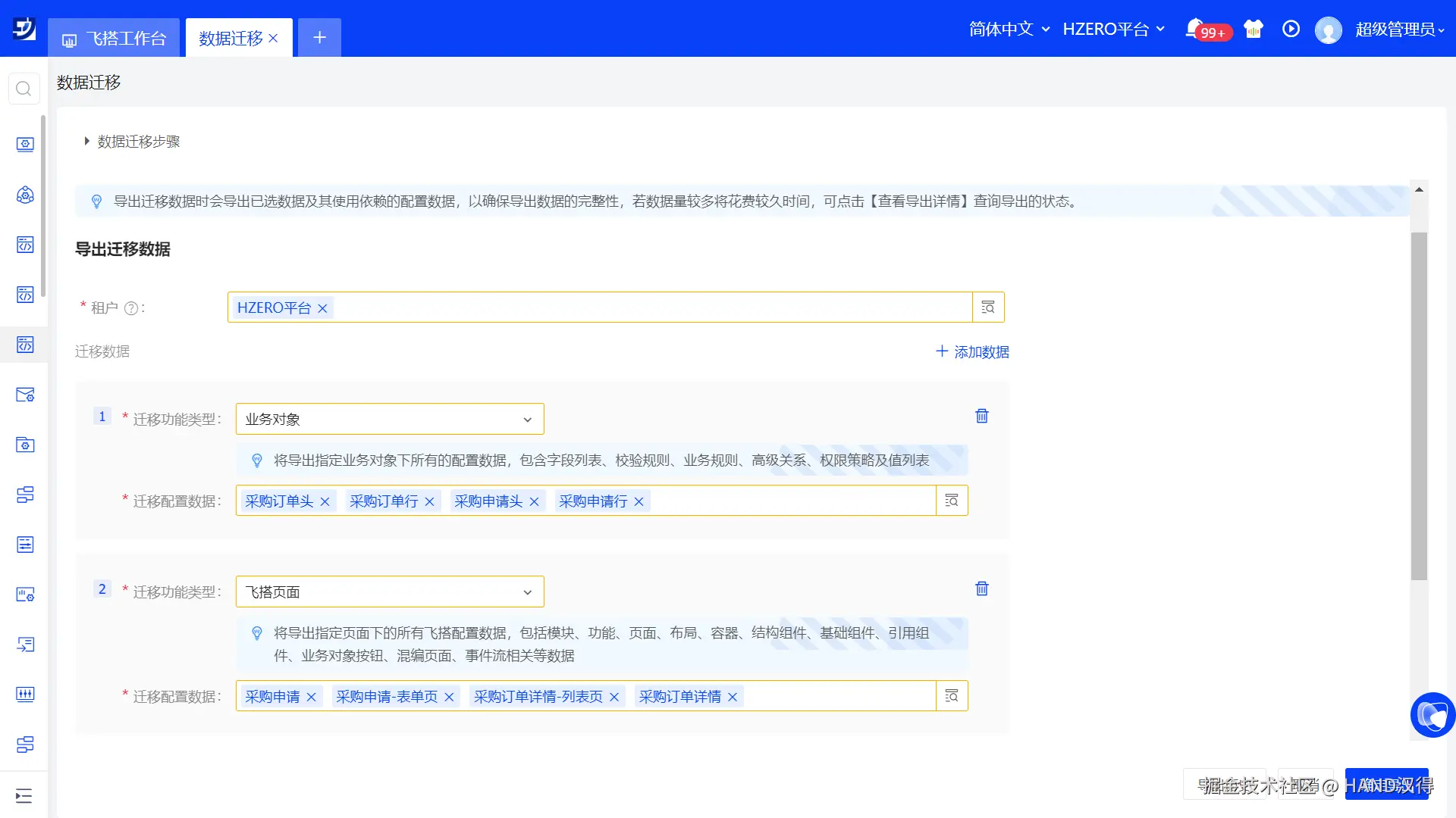飞搭搭建应用可以调用HZERO基础服务能力,所以应用迁移时,会级联迁移依赖的HZERO数据。