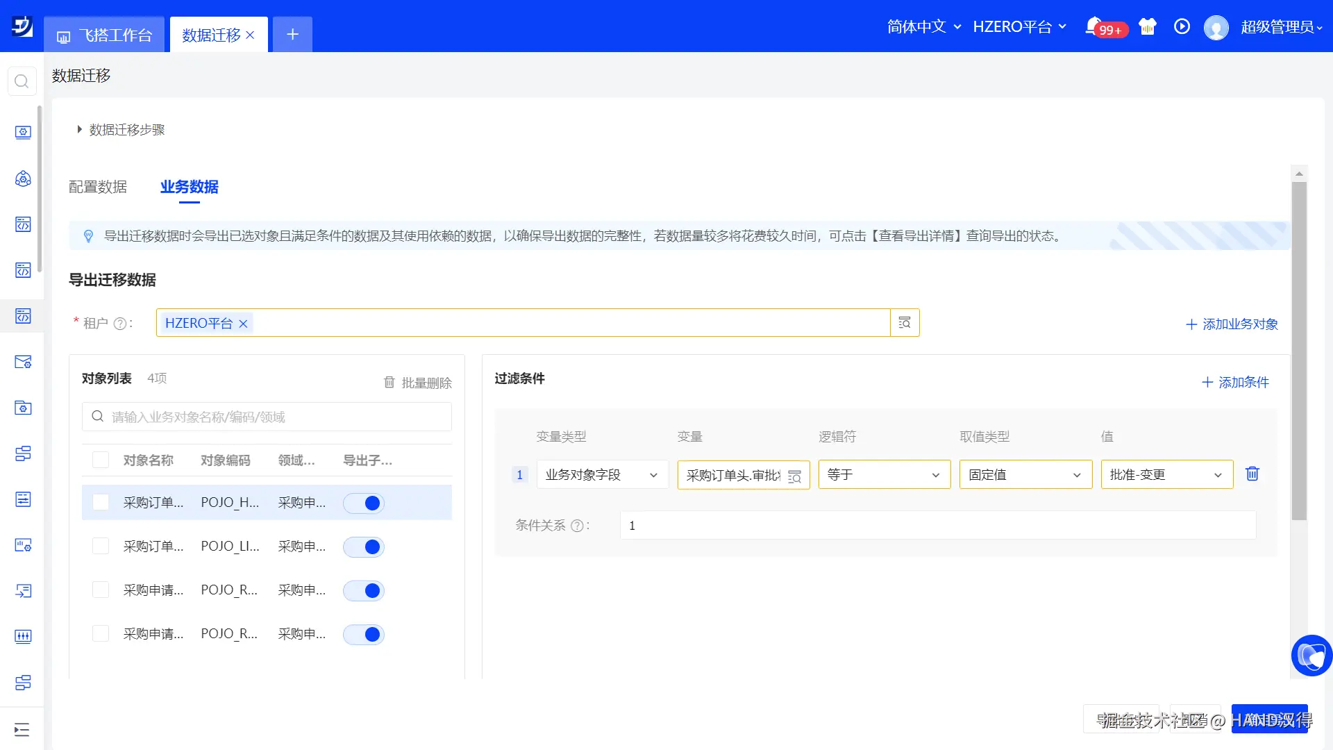 - 新系统构建完成之后,在旧系统中,进入飞搭业务数据迁移功能,选择需要迁移业务数据的业务对象;