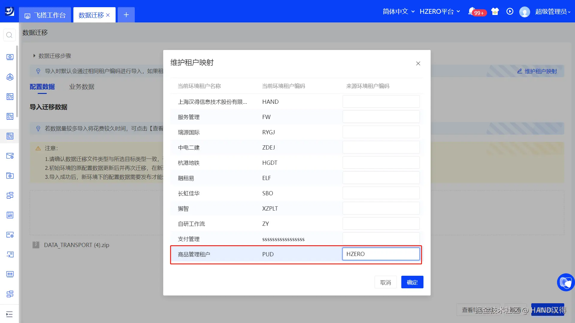 配置数据迁入时,飞搭支持跨租户迁移,将配置数据迁移至不同的租户环境内,并自动进行数据适配和转换。