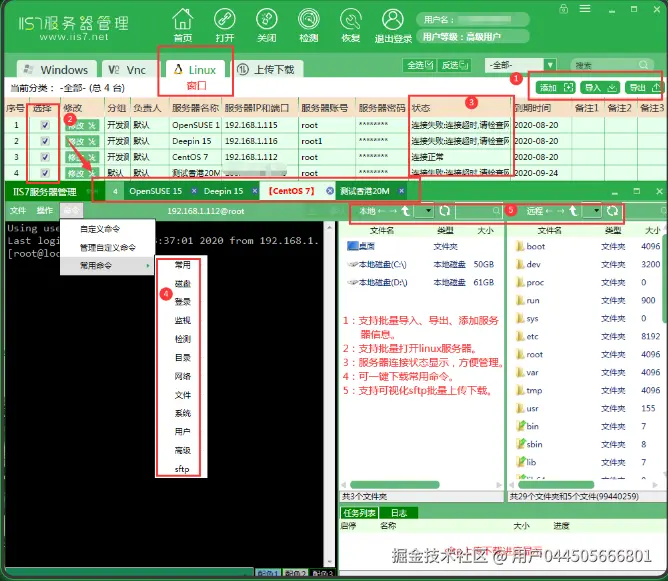 首先要下载IIS7服务器管理工具,在下载完毕后解压此文件,然后打开IIS7服务器管理.exe,接下来轻点”添加“,在弹出的添加服务器对话框里,精准填入目标服务器的IP地址、端口号、用户名及密码,随后按照远程机器系统的情况选择对应的板块。若要连接SSH服务器,保存设置后,双击对应的服务器条目,就能迅速建立连接,随即呈现出熟悉的SSH界面,在此可流畅执行各类命令行操作,如图所示: