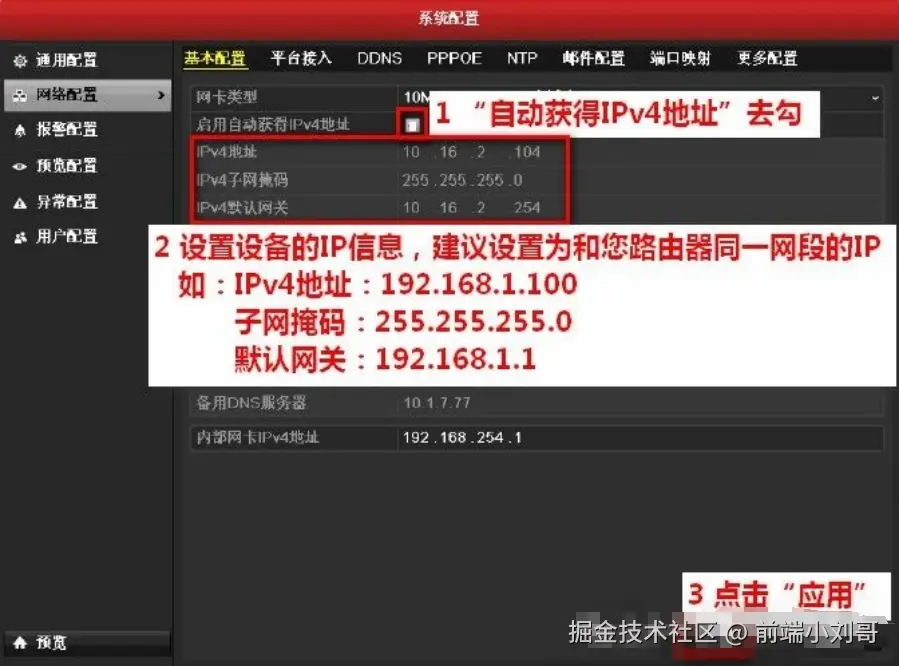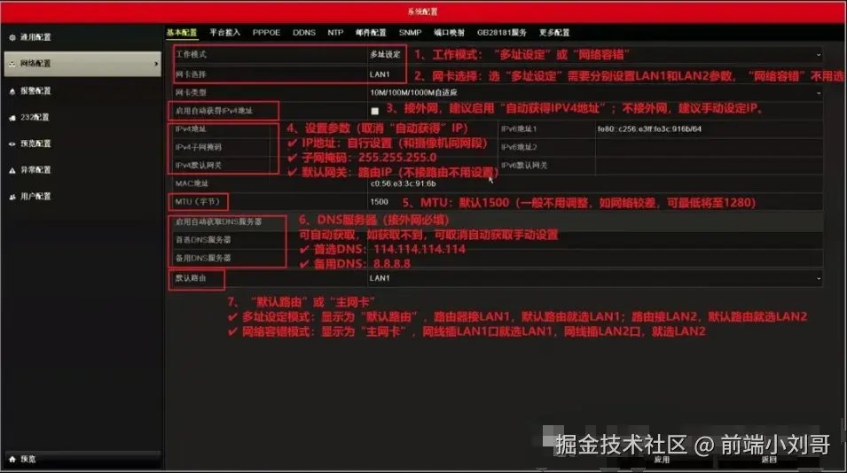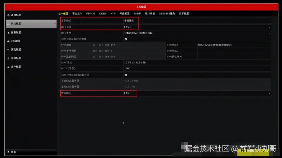 进入录像机主菜单—系统配置—网络配置—基本配置界面,将工作模式改为"多址设定",网卡选择LAN1,设置LAN1的IP地址可自动获取(或手动设置为192.168.1.100)以及其他网络参数,默认路由选择LAN1,点击“应用”;