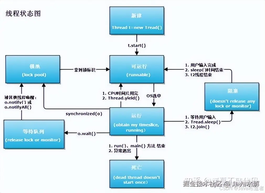 3) 其他阻塞:通过调用线程的 sleep()或 join()或发出了 I/O 请求时,线程会进入到阻塞状态。当 sleep()状态超时、join()等待线程终止或者超时、或者 I/O 处理完毕时,线程重新转入就绪状态。