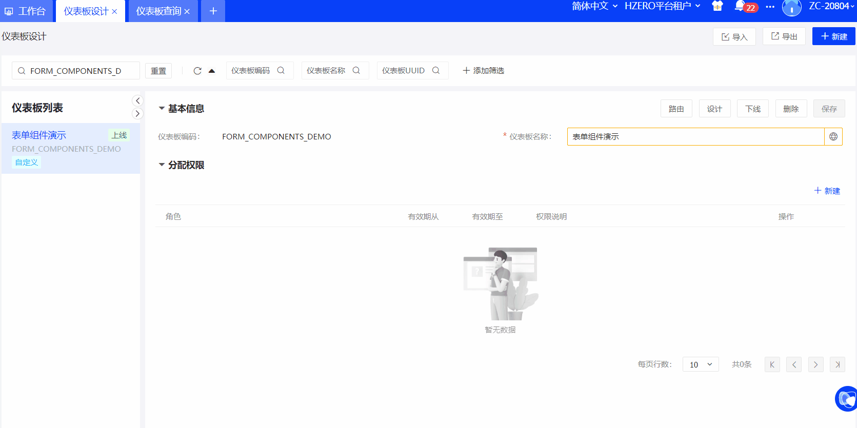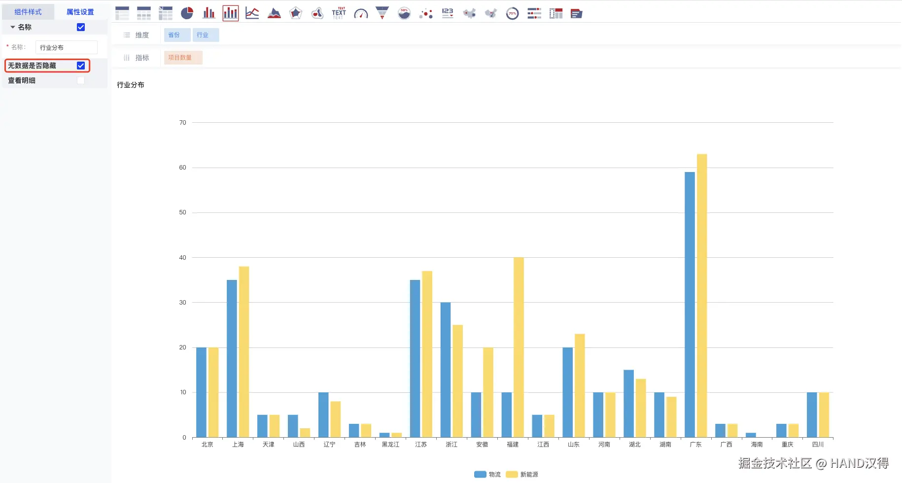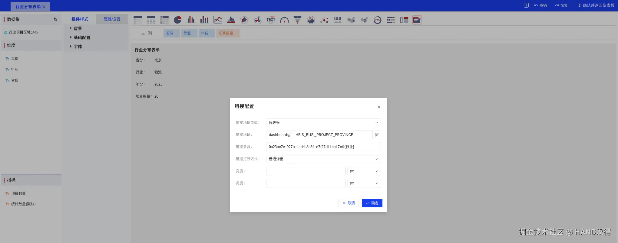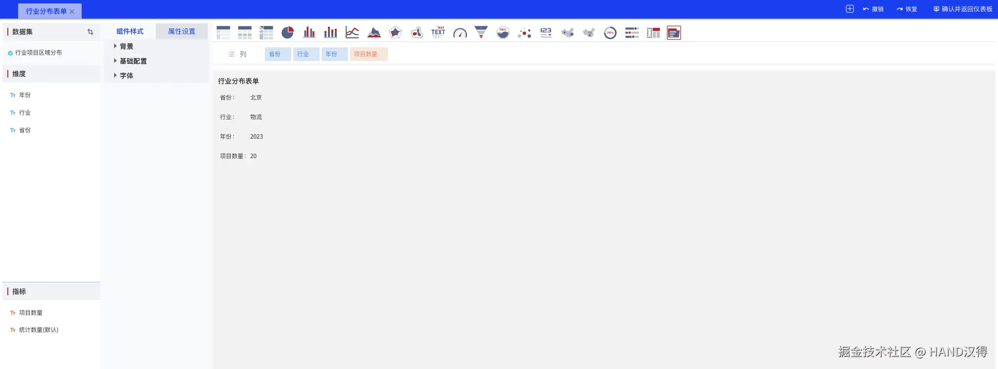 维护行业分布表单组件: 在仪表板设计界面维护行业分布表单组件,具体配置如下所示: