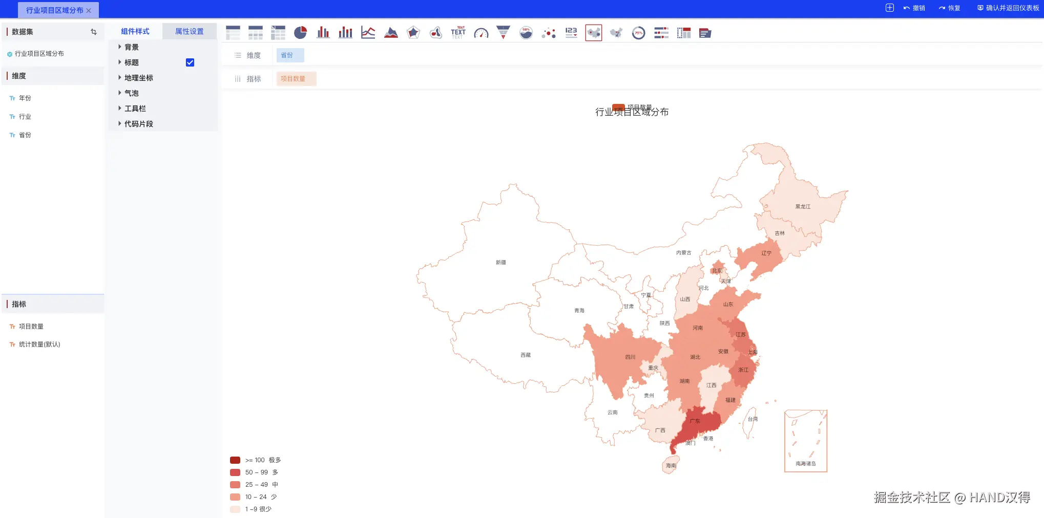维护行业项目分布组件: 进入到仪表板设计界面维护行业项目区域分布仪表板。如下所示: