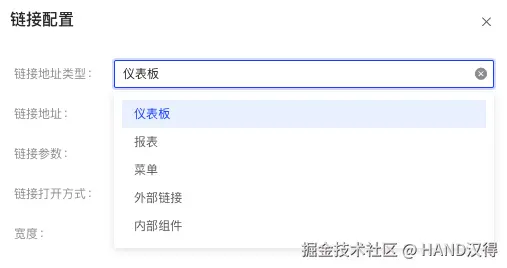 - 打开方式灵活: 除内部组件外其他类型支持配置链接打开方式,目前支持新窗口、普通弹窗、抽屉三种方式来满足项目需求并支持自定义高度和宽度。