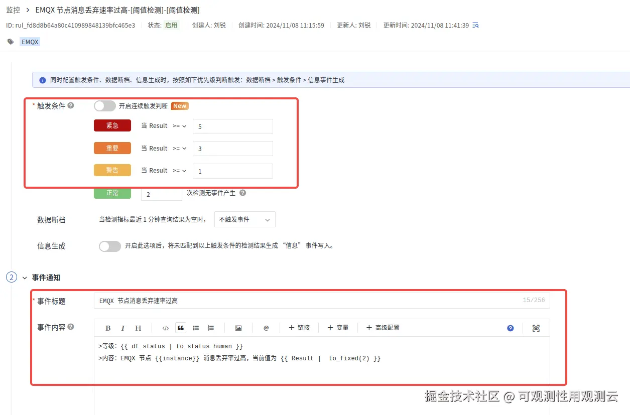 如果消息丢弃数量突然增加,可能表明系统过载,设置告警。