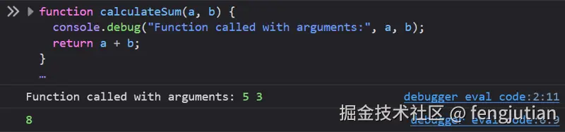 console.log(calculateSum(5, 3)); // Logs the debug message first, then the sum.