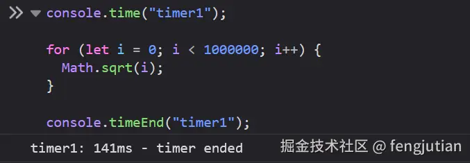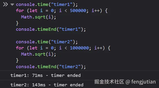 console.time()和console.timeEnd()方法用于测量代码执行所用的时间。